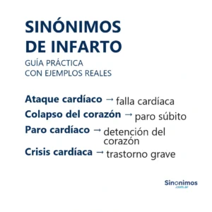 Sinónimos de infarto en español Los sinónimos de “infarto” abarcan expresiones como ataque al corazón, ataque cardíaco, infarto de miocardio,