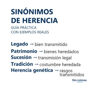 Sinónimos de herencia en español Los sinónimos de “herencia” abarcan matices como legado, sucesión, patrimonio, acervo, tradición, linaje, ascendencia, herencia