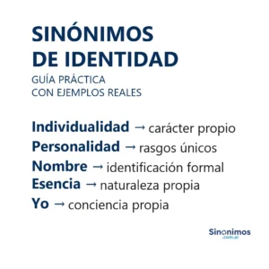 Sinónimos de identidad en español Los sinónimos de “identidad” abarcan matices como individualidad, personalidad, idiosincrasia, carácter, esencia, ser, yo, mismidad, […]