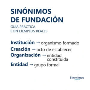 Sinónimos de fundación en español Los sinónimos de “fundación” abarcan matices como creación, establecimiento, constitución, instauración, origen, base, cimiento, institución,