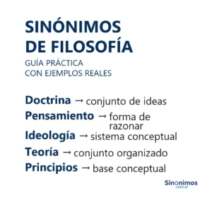 Sinónimos de filosofía en español Los sinónimos de “filosofía” abarcan matices como doctrina, pensamiento, teoría, enfoque, concepción, cosmovisión, sistema de