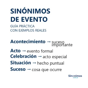 Sinónimos de evento en español Los sinónimos de “evento” abarcan matices como acontecimiento, suceso, hecho, incidente, episodio, acto, celebración, fiesta,