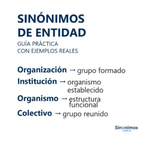 Sinónimos de entidad en español Los sinónimos de “entidad” abarcan matices como ser, ente, esencia, organismo, institución, organización, empresa, persona