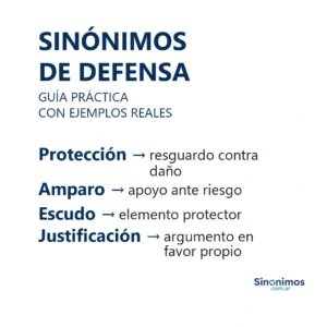 Sinónimos de defensa en español Los sinónimos de “defensa” abarcan matices como protección, amparo, resguardo, salvaguardia, apoyo, respaldo, alegato, argumentación,