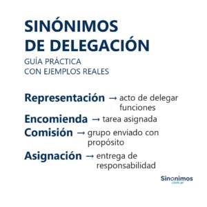 Sinónimos de delegación en español Los sinónimos de “delegación” abarcan matices como representación, comitiva, comisión, misión, sucursal, filial, oficina, transferencia