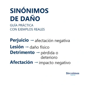 Sinónimos de daño en español Los sinónimos de “daño” abarcan matices como perjuicio, deterioro, lesión, menoscabo, estrago, quebranto, agravio, desperfecto