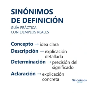 Sinónimos de definición en español Los sinónimos de “definición” incluyen matices como explicación, descripción, concepto, significado, acepción, delimitación, precisión, formulación,