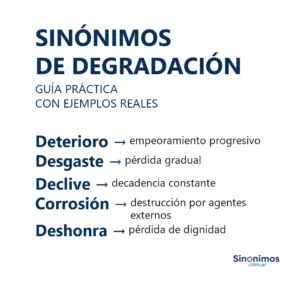 Sinónimos de degradación en español Los sinónimos de “degradación” abarcan matices como deterioro, desgaste, declive, decadencia, menoscabo, envilecimiento, humillación, deshonra,