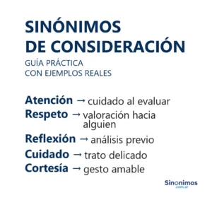 Sinónimos de consideración en español Los sinónimos de “consideración” abarcan sentidos como respeto, estima, aprecio, miramiento, atención, reflexión, análisis, valoración,