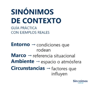 Sinónimos de contexto en español Los sinónimos de “contexto” abarcan sentidos como entorno, marco, situación, circunstancias, escenario, ambiente, ámbito o