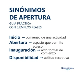 Sinónimos de apertura en español Los sinónimos de “apertura” abarcan sentidos como abertura, hueco, boquete, inicio, comienzo, inauguración, puesta en