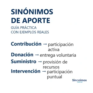 Sinónimos de aporte en español Los sinónimos de “aporte” abarcan sentidos como contribución, aportación, colaboración, ayuda, donación, participación, cuota, input