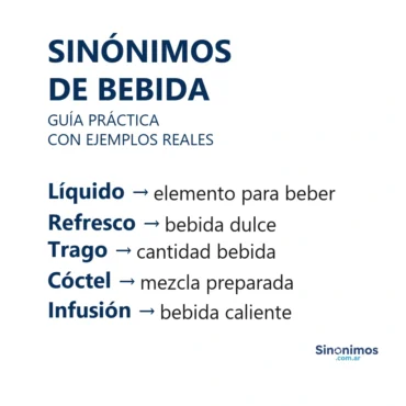 Sinónimos de bebida en español Los sinónimos de “bebida” abarcan palabras como trago, copa, refresco, licor, consumición, líquido, brebaje, cóctel,