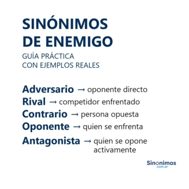 Sinónimos de enemigo en español Los sinónimos de “enemigo” abarcan términos como adversario, rival, oponente, contrario, antagonista, contrincante, contendiente, opositor