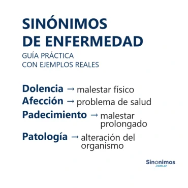 Sinónimos de enfermedad en español Los sinónimos de “enfermedad” incluyen matices como dolencia, padecimiento, afección, trastorno, patología, mal, problema de