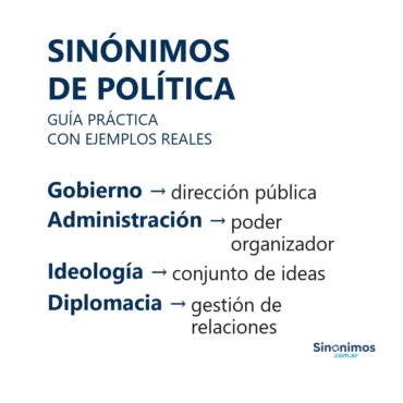 Sinónimos de política en español Los sinónimos de “política” abarcan sentidos como gobierno, gestión pública, vida pública, actividad política, estrategia,
