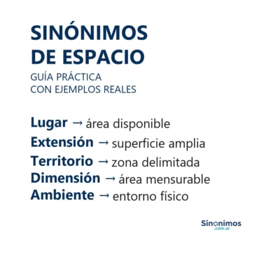 Sinónimos de espacio en español Los sinónimos de “espacio” abarcan sentidos como lugar, sitio, área, zona, hueco, vacío, intervalo, margen,