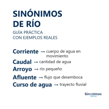 Sinónimos de río en español Los sinónimos de “río” abarcan palabras como curso de agua, corriente, arroyo, riachuelo, torrente, caudal,