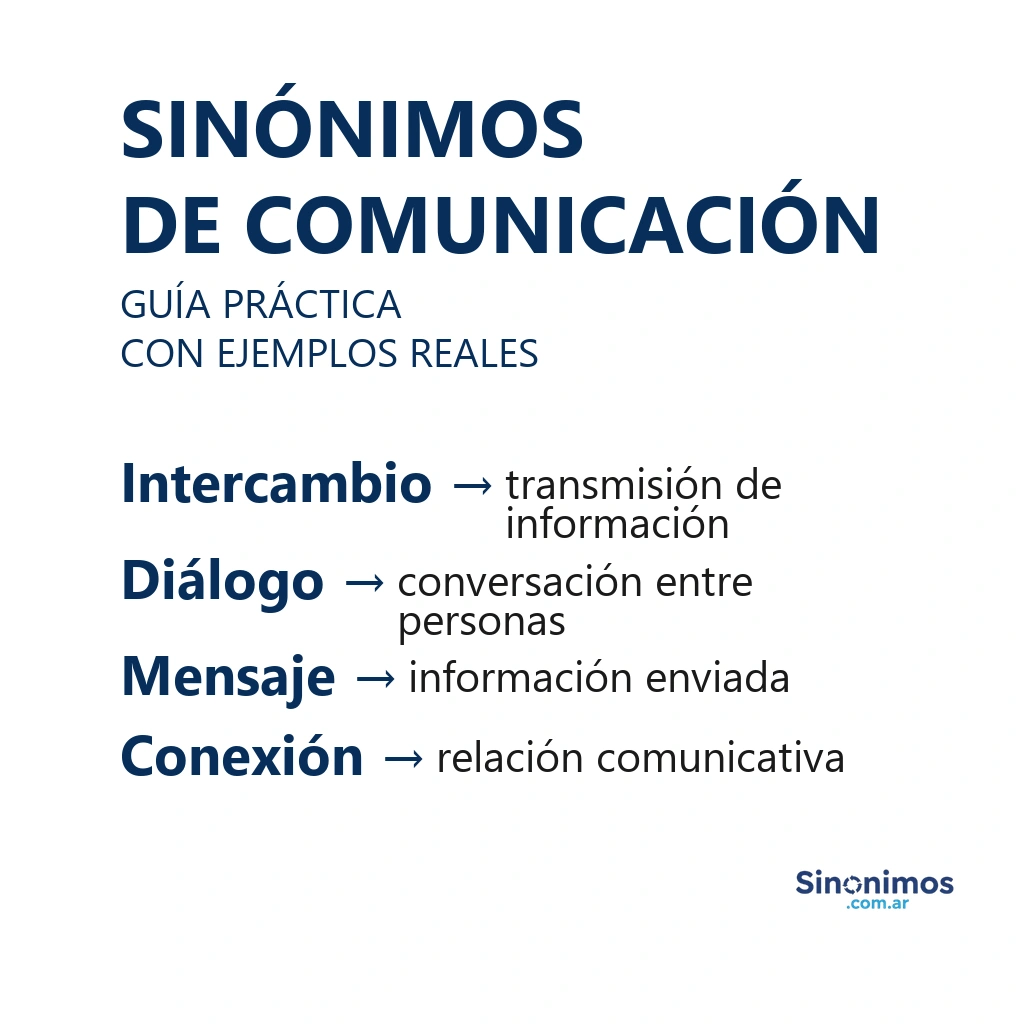 A continuación se agrupan los sinónimos de “comunicación” según el tipo de intercambio (personal, institucional, masivo, técnico) y el alcance del mensaje.