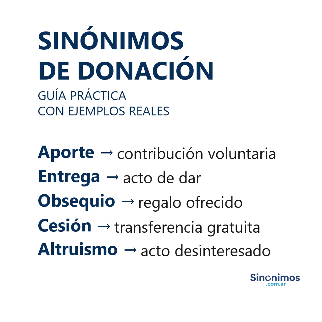 | Donación religiosa | ofrenda, limosna, dádiva, caridad | En contextos de culto se usan “ofrendas” o “limosnas” como variantes de donación, con un matiz religioso o espiritual. |