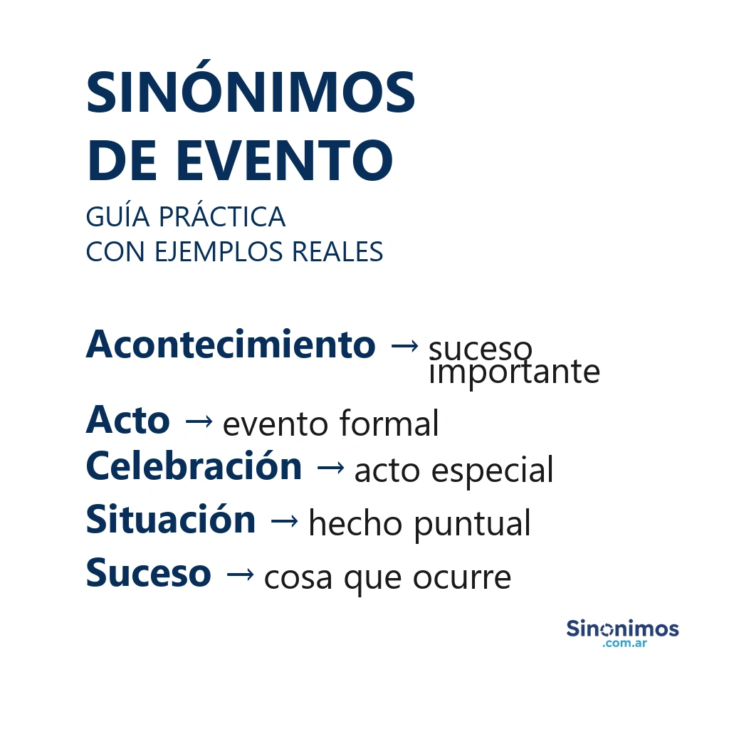 En redacción cuidada, conviene elegir el sinónimo según el matiz: acontecimiento o suceso para hechos generales, celebración o fiesta para actos festivos, jornada o congreso para eventos profesionales y espectáculo o función para actividades culturales.