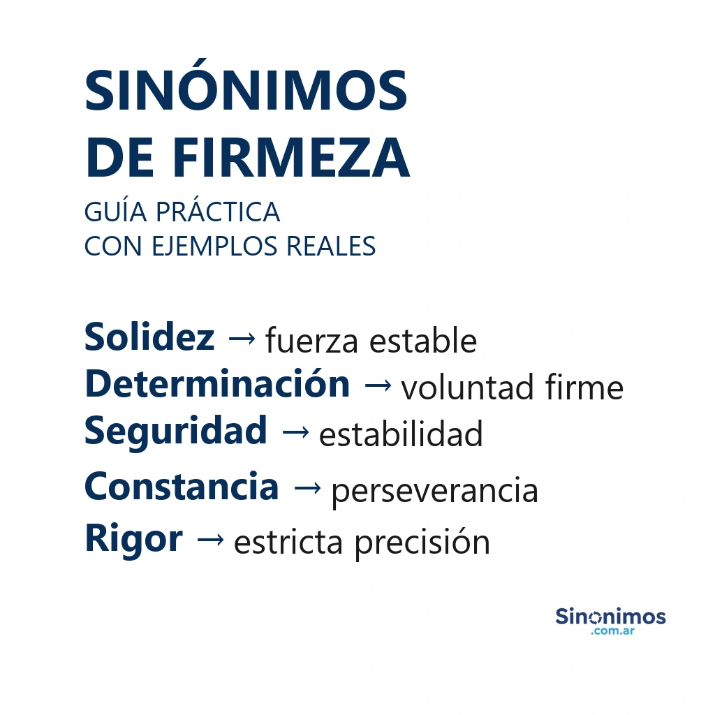Dependiendo del contexto, “firmeza” puede equivaler a estabilidad, solidez, determinación, entereza, constancia, aplomo o rigidez. La siguiente tabla resume los usos principales y los sinónimos más adecuados.