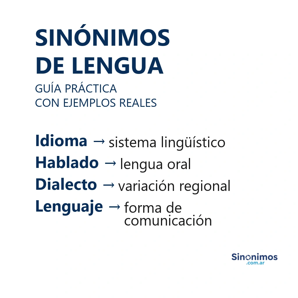 Los sinónimos de “lengua” abarcan sentidos como idioma, lenguaje, habla, sistema lingüístico, lengua materna, idioma nativo, dialecto, jerga o argot, además de su uso para nombrar el órgano bucal. “Lengua” puede referirse a un idioma concreto, a la forma de hablar de una comunidad, al registro o estilo de expresión, al órgano muscular de la boca o, en sentido figurado, a la murmuración y el chisme.