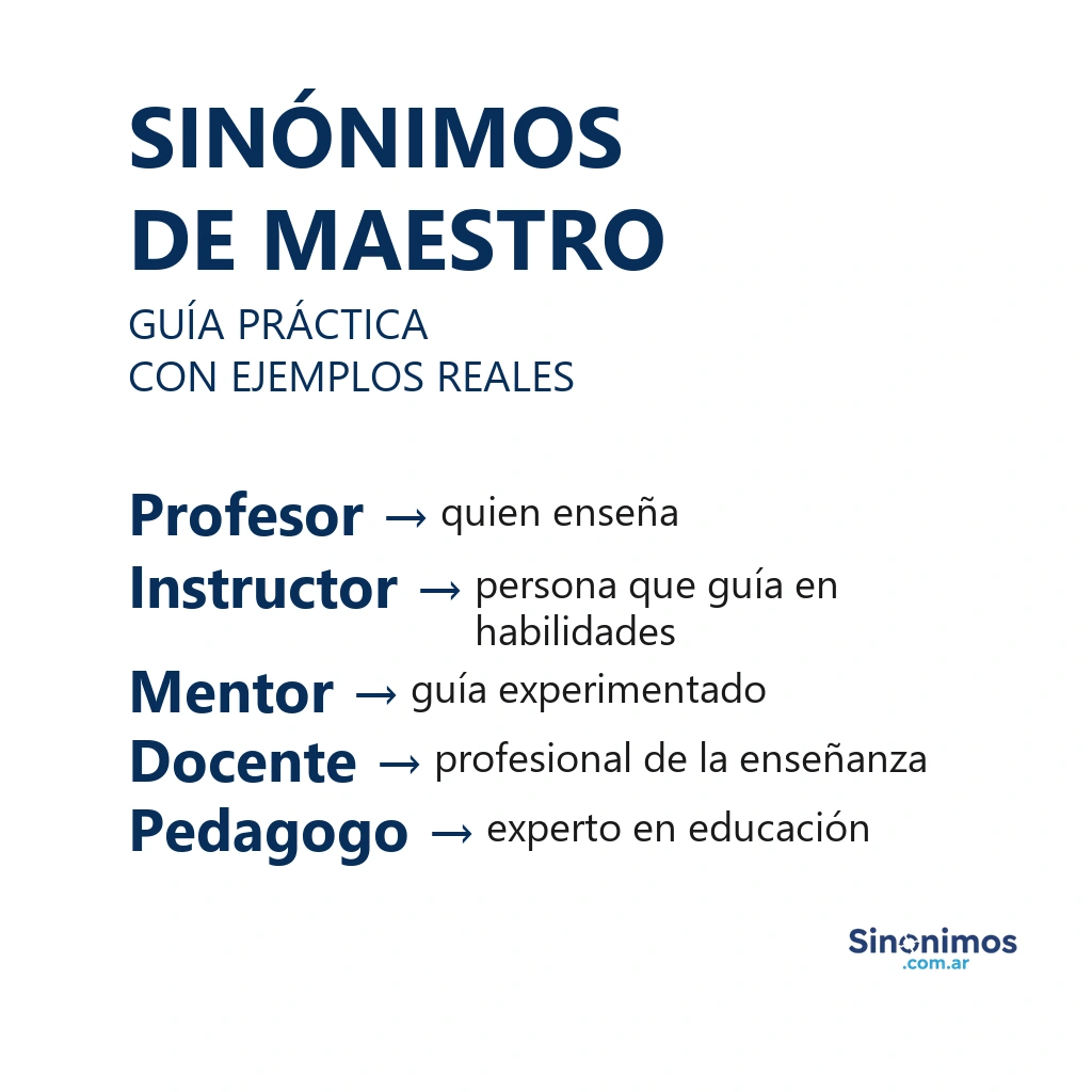 Los sinónimos de “maestro” abarcan sentidos como docente, profesor, educador, instructor, pedagogo, tutor, mentor, guía, experto o virtuoso en un arte u oficio. “Maestro” puede referirse al docente de nivel primario, a cualquier profesional de la enseñanza, a un especialista admirado en su disciplina o a un artesano o artista de gran prestigio.
