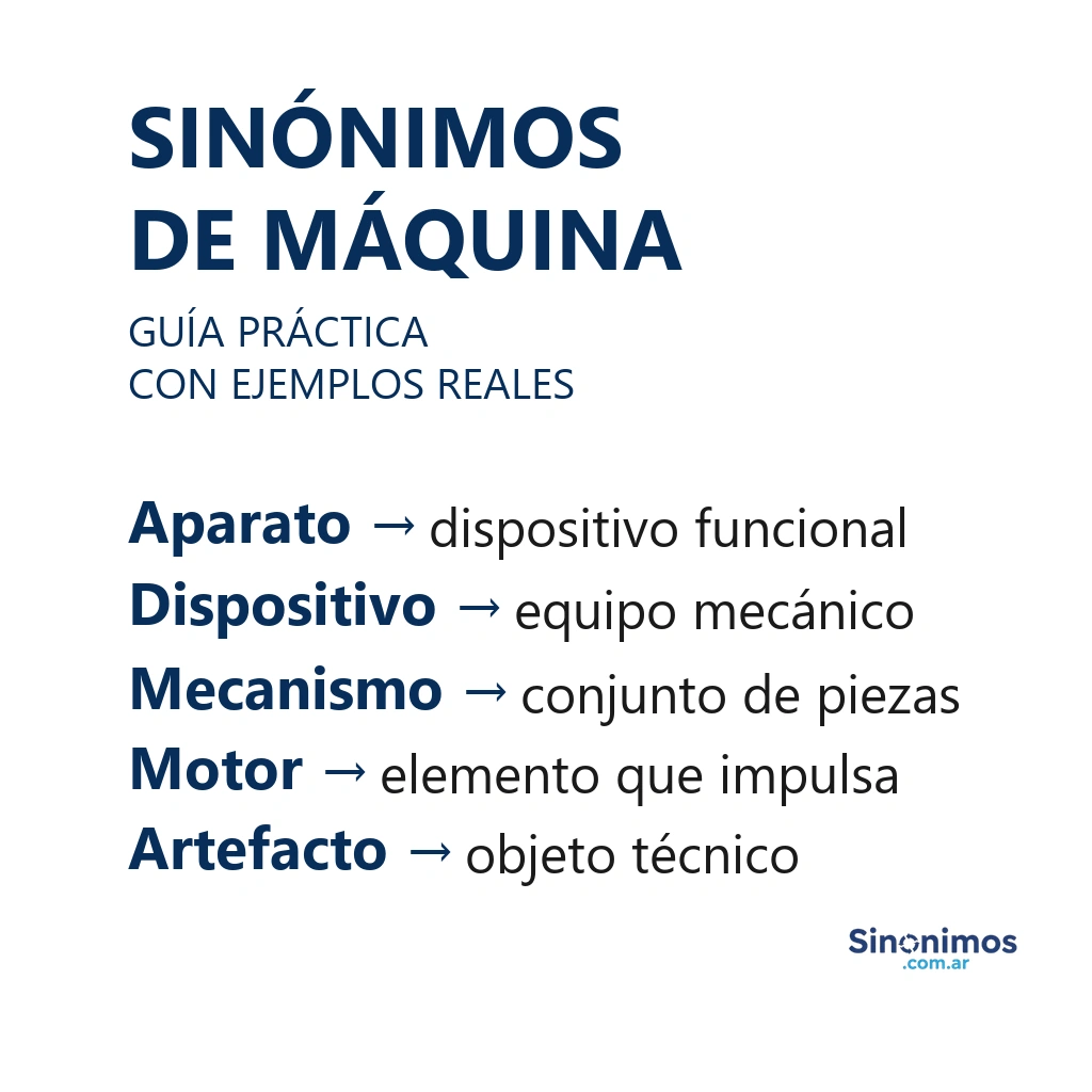 Los sinónimos de “máquina” abarcan matices como aparato, dispositivo, artefacto, mecanismo, motor, equipo, maquinaria, robot, autómata u ordenador/computadora. “Máquina” puede referirse a un aparato mecánico, a equipos industriales, a equipos informáticos o, en sentido figurado, a una persona muy eficiente o incansable.