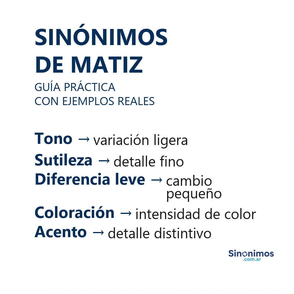 | Matiz emocional | sutileza, tono, viso, aspecto, coloración | “Su sonrisa tenía un matiz triste” ≈ “un tono triste”, “un viso de tristeza”. |