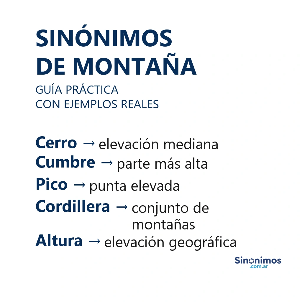 Los sinónimos de “montaña” abarcan palabras como monte, cerro, colina, sierra, cordillera, macizo, serranía, pico, cumbre o loma. Según el contexto, “montaña” puede referirse a una gran elevación natural del terreno, a una zona serrana o, en sentido figurado, a una gran cantidad de algo o a un gran desafío por superar (“una montaña de trabajo”, “una montaña de problemas”).