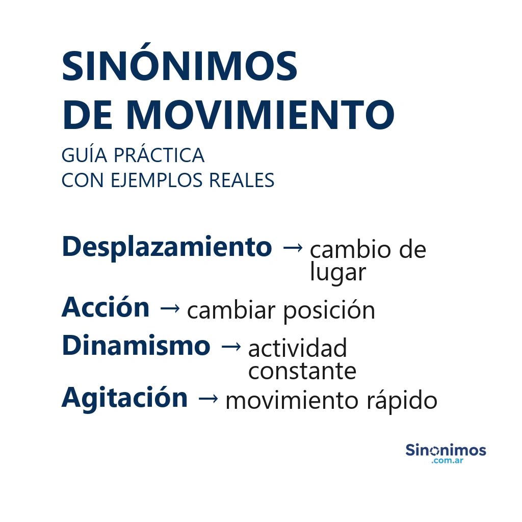 - Evitá repeticiones excesivas de “movimiento” en un mismo párrafo: alternar con desplazamiento, actividad, dinamismo, gesto o transacción hace el texto más fluido y preciso.