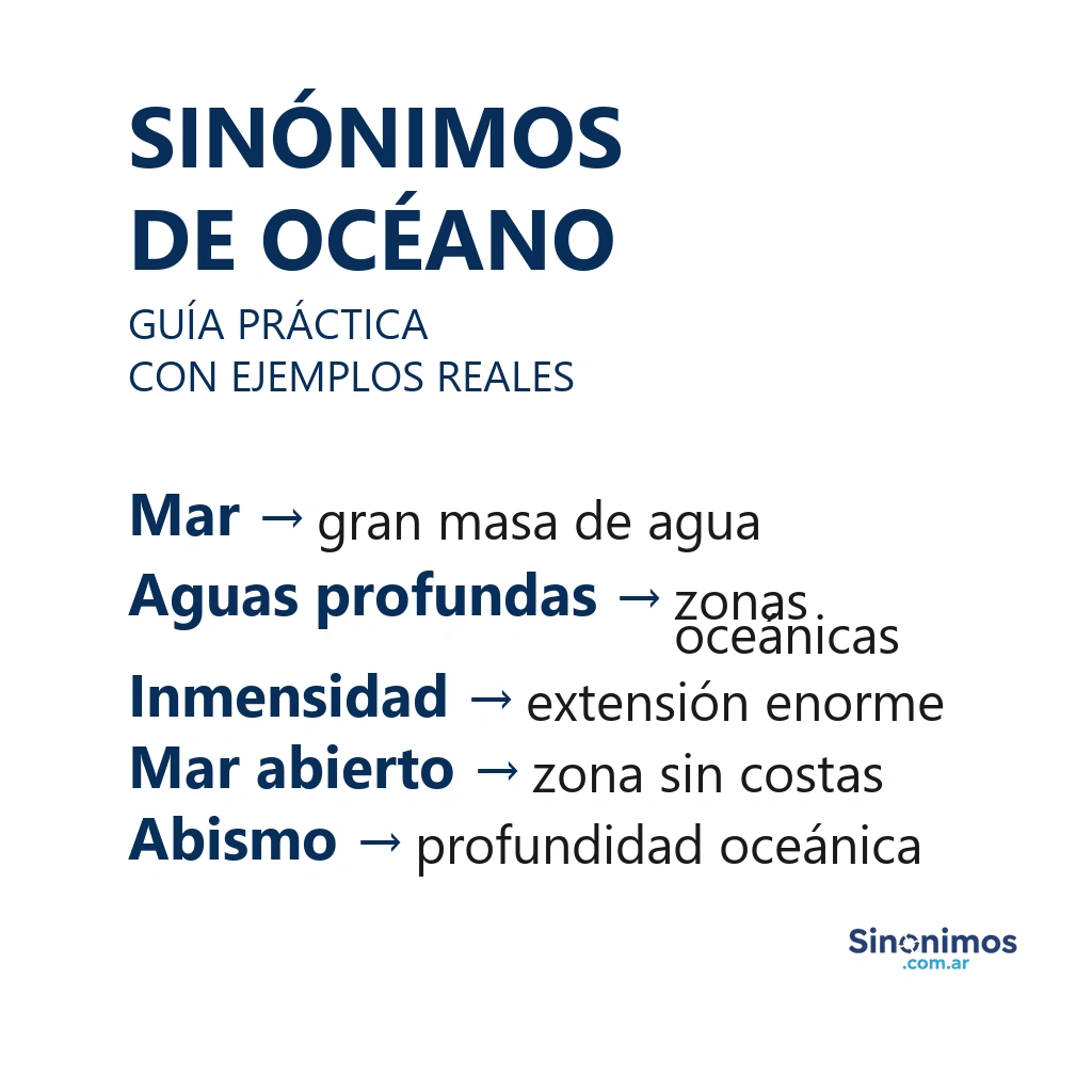 Los sinónimos de “océano” abarcan matices como mar, mar abierto, alta mar, mar profundo, piélago, inmensidad, vastedad, abismo o sinfín. “Océano” puede referirse tanto a la gran masa de agua salada que rodea los continentes como, en sentido figurado, a una inmensidad o abundancia difícil de abarcar.