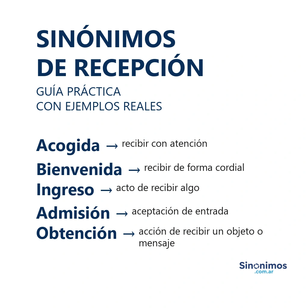 “Recepción” es una palabra frecuente tanto en el lenguaje formal (administrativo, académico, hotelero) como en registros más informales. Algunos sinónimos se usan en documentos, contratos o contextos profesionales, mientras que otros aparecen en la conversación cotidiana.